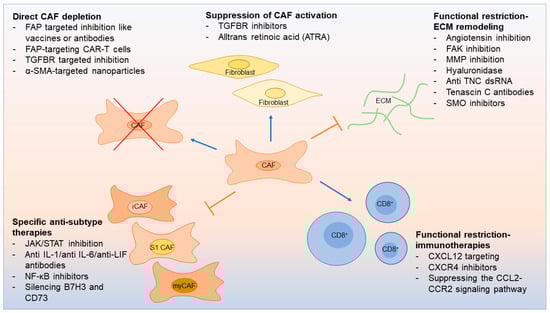 In PDAC, up to 90% of the tumor volume consists of stroma [59]. In HNSCC, CAFs can account for up to 80% of the tumor mass [72]. The tumor–stroma ratio has been shown to have prognostic importance [73], and evaluating this ratio can also garner insights into clinical disease [74]. Tumor stroma may block delivery of therapy to cancer cells, support cancer growth, and promote therapy resistance [48]. On the other hand, the tumor stroma may also contain potential targets for potential therapy. Recently, the number of preclinical experiments targeting CAFs to restore the anticancer immune response has increased dramatically. Further, strategies for CAF-based immunotherapy have emerged: direct CAF depletion including a novel therapeutic that uses FAP-targeting chimeric antigen receptor (CAR)-T cells [5] resulting in reduced CAF activation [75] and functional suppression of CAF-induced ECM remodeling [76,77,78] (Figure 2).