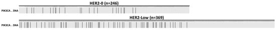 When the called gene alterations in the HER2-0 group were compared with those in the HER2-low group, there was a significantly higher frequency of 17.62% (65/369) for PIK3CA_SNA in HER2-low group than in the HER2-0 group, which had sample frequency of 9.35% (23/246) (p = 0.006, Chi-Square test). The oncoplot is presented in Figure 1.
