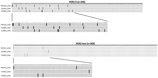 Among the 246 HER2-0 patients, 112 (45.5%) tumors showed copy number alteration (CNA), while 185 tumors (50.1%) in the 369 HER2-low patients had CNA mutations. In addition, there was a significantly higher frequency of PIK3CA_CNA (2.85%), CCND3_CNA (2.44%), and CCND2_CNA (2.85%) mutations in the HER2-0 group than in the HER2-low group, which had frequencies of 0.54%, 0.27%, and 0.54%, respectively (p < 0.05, Chi-Square test). The oncoplot result is presented in Figure 2. The mutation details of Figure 1 and Figure 2 are shown in Table 5.