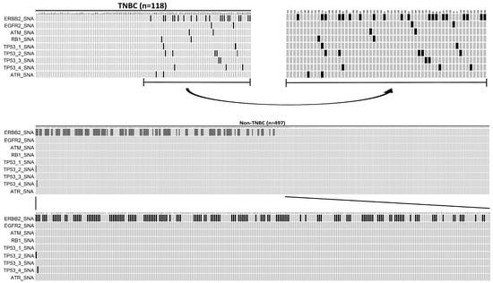 In this 615-patient cohort study, 118 (19.19%) were TNBC, while 497 (80.81%) were luminal-like tumors. When the called gene alterations in the TNBC group were compared with those identified in the luminal-like group, there was a significantly high sample frequency of 28.17% (140/497) for ERBB2_SNA in a luminal-like group compared to the TNBC group, where the frequency was 16.95% (20/118) (p = 0.014, Fisher’s exact test). In contrast, there was a significantly higher sample frequency of SA (ATR/ATM) and SNA (FGFR2, RB1, TP53) in the TNBC group compared to the luminal-like group (p < 0.05, Fisher’s exact test). The oncoplot result is presented in Figure 3.The mutation details of Figure 3 are shown in Table 6.