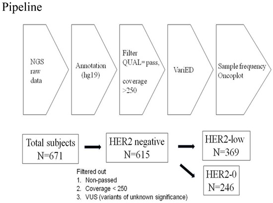 Pipeline of next-generation sequencing analysis in this study. From 2018-1 to 2020-1, a total of 671 patients with HER2-negative tumors were included. The raw data of NGS were annotated usinghg19 human genome reference and VariED database. The statistical significance of sample frequency of mutations was selected between HER2-0 andHER2-low groups with a p value < 0.05 via Chi-square test or Fisher’s exact test. Among 671 tumors receiving NGS target sequencing, those data with non-pass quality, coverage < 250, and variants with unknown significance were excluded. Finally, 615 patients with HER2-negative tumors were categorized into HER2-0 (n = 246) and HER2-low (n = 369) groups. The definition of HER2-0 and HER2-low was HER2-0, immunohistochemistry score (IHC) 0, and HER2-low, IHC score 1+/2+, and FISH-negative, respectively.