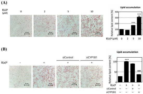 CYP1B1 knockdown reduces B[a]P-induced hepatic lipid accumulation. HepG2 cells were subjected to Oil-Red O (ORO) staining to assess lipid accumulation. (A) The quantification of lipid accumulation in hepatocytes following B[a]P treatment at concentrations ranging from 2 μM to 10 μM. (B) Lipid accumulation after CYP1B1 knockdown in B[a]P exposure conditions. *** p < 0.001, compared with the non-treated group; ### p < 0.001, compared with the siControl group. B[a]P: benzo[a]pyrene (10 μM). All experiments were performed in triplicate and repeated three times.