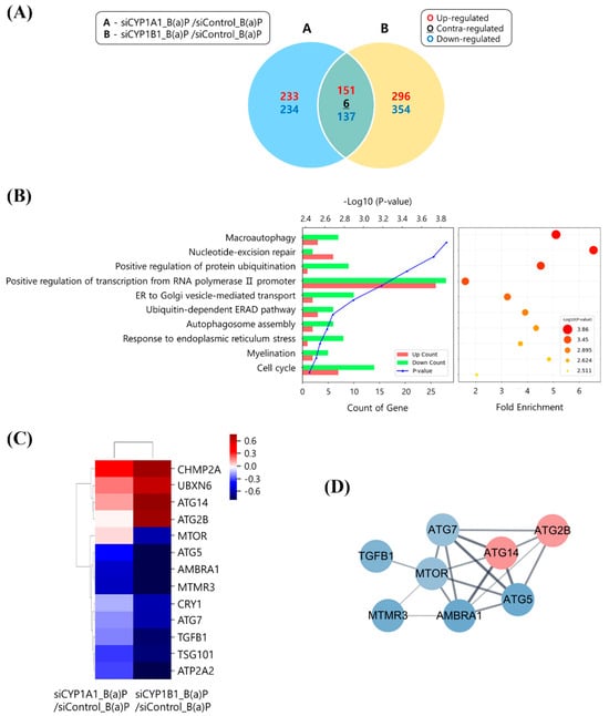 To determine how CYP1B1 knockdown reduces B[a]P-induced hepatic lipid accumulation and the genes that are involved, we knocked down the CYP enzymes and performed transcriptome analysis. After the knockdown of CYP1A1 and CYP1B1, the alterations in gene expression were analyzed and compared. Specifically, CYP1A1 knockdown led to changes in 467 genes, while CYP1B1 knockdown resulted in changes in 650 genes. Among the 650 genes that were specifically influenced by CYP1B1 knockdown, 296 and 354 genes were up- and downregulated, respectively (Figure 2A). We performed gene ontology (GO) analysis and gene fold enrichment analysis on the genes that were specifically modulated by CYP1B1 knockdown. We confirmed that the DEGs are related to ‘autophagosome assembly’, ‘response to endoplasmic reticulum stress’, and ‘cell cycle’, which are processes associated with macroautophagy (Figure 2B). This indicates that CYP1B1 plays a regulatory role in macroautophagy and lipid accumulation in hepatocytes. Subsequently, 13 macroautophagy-related DEGs were selected and utilized for hierarchical clustering heatmap and protein–protein interaction (PPI) analyses. Our analyses confirmed a significant reduction in the mTOR gene and identified genetic interactions between mTOR and macroautophagy-related genes after CYP1B1 knockdown (Figure 2C,D). These results suggest that CYP1B1 has a regulatory effect on the expression of macroautophagy-related genes, particularly mTOR.