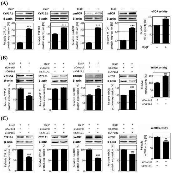 Protein level and the activity of mTOR are specifically reduced by CYP1B1. To verify the results obtained from transcriptome analysis following CYP enzymes knockdowns, mTOR expression and activity were analyzed at protein levels using Western blot analysis. (A) Increased protein levels of CYP1A1, CYP1B1, mTOR, and pmTOR after B[a]P treatment were investigated. (B) Protein levels of CYP1A1, CYP1B1, mTOR, and pmTOR after CYP1A1 knockdown were investigated. (C) Decreased protein levels of CYP1B1, CYP1A1, mTOR, and pmTOR following CYP1B1 knockdown were investigated. ** p < 0.01, *** p < 0.001, compared with the non-treated group; ## p < 0.01, ### p < 0.001, compared with the siControl group. B[a]P: benzo[a]pyrene (10 μM). The ratio between pmTOR and mTOR expression was calculated and expressed as mTOR activity. All experiments were performed in triplicate and repeated three times.