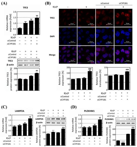 CYP1B1 knockdown induces TFE3 nuclear translocation and its target gene expression. (A) mRNA and protein expression levels of TFE3 were detected using RT-qPCR and Western blot analysis, respectively. (B) TFE3 expression and nuclear translocation levels were visualized using immunofluorescence analysis. The TFE3 expression level was quantified based on the red fluorescence of the entire cell. The translocation of TFE3 was calculated as the ratio of red fluorescence values in the whole cells and nucleus. mRNA and protein expression levels of TFE3 downstream target genes, (C) LAMP2A and (D) PLEKHM1, were confirmed using RT-qPCR and Western blot analysis following B[a]P treatment and CYP1B1 knockdown. ** p < 0.01, *** p < 0.001, compared with the non-treated group; ## p < 0.01, ### p < 0.001, compared with the siControl group. B[a]P: benzo[a]pyrene (10 μM). The ratio between pmTOR and mTOR expression was calculated and expressed as mTOR activity. All experiments were performed in triplicate and repeated three times.