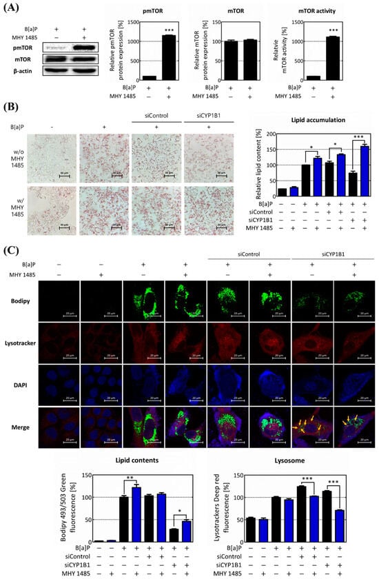 Up-regulation of mTOR activity increases intracellular lipid accumulation and reduces lipophagy. To investigate the role of mTOR in regulating lipophagy, its effects were assessed through treatment with the mTOR activator, MHY 1485. (A) mTOR expression level and activity were analyzed following MHY 1485 treatment. (B) The increase in lipid accumulation after MHY 1485 treatment was confirmed using ORO staining. (C) Intracellular lipid accumulation, lysosome, and phagolysosome production were assessed using Bodipy and Lysotracker after MHY 1485 treatment. Intracellular neutral lipid is represented in the graph by calculating the intracellular green fluorescence, and lysosome is expressed in the graph by red fluorescence. Yellow arrows indicate the co-localization of lipids and lysosomes * p < 0.05, ** p < 0.01, *** p < 0.001, compared with each MHY 1485 non-treated group. B[a]P: benzo[a]pyrene (10 μM); MHY 1485: mTOR activator (2 μM). w/o MHY 1485: treat without MHY 1485; w/MHY 1485: treat with MHY 1485. The blue bars indicate the treatment of MHY 1485. All experiments were performed in triplicate and repeated three times.