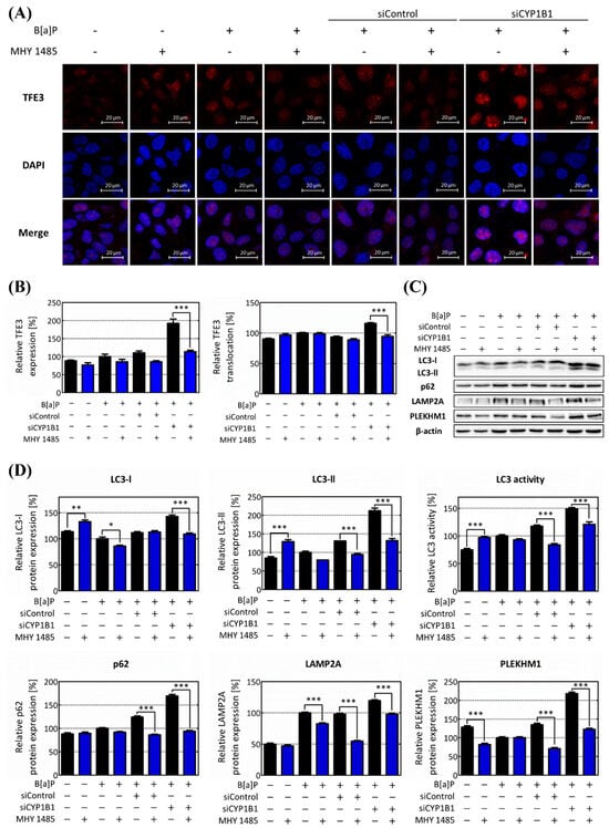To confirm the regulatory role of B[a]P-induced CYP1B1 expression on lipophagy, the expression levels of TFE3 and its downstream target genes were evaluated. Upon CYP1B1 knockdown, both the TFE3 mRNA and protein levels exhibited increments, reaching 1.2-fold and 117.05%, respectively, in comparison to the siControl group (Figure 5A). We further confirmed the intracellular expression of TFE3 and its nuclear translocation by immunofluorescence analysis. Upon CYP1B1 knockdown, the TFE3 expression increased to 165.09% compared to the B[a]P-treated group and 159.89% compared to the siControl group. Thereafter, the TFE3 nuclear translocation was quantified as the proportion within the nucleus relative to the total intracellular TFE3 content. The TFE3 translocation was confirmed as being 93.68%, 100%, 97%, and 121.45% in the non-treated group, B[a]P-treated group, siControl group, and CYP1B1 knockdown group, respectively. Following CYP1B1 knockdown, the TFE3 nuclear translocation escalated to 129.64% and 125.20%, compared to the non-treated group and siControl group, respectively (Figure 5B). Subsequently, we validated the expression levels of the lipophagy-related genes, which were located downstream of TFE3. The mRNA and protein levels of the lysosomal-associated membrane protein 2A (LAMP2A) also increased following CYP1B1 knockdown, exhibiting 1.42-fold and 131% increases compared to the siControl group (Figure 5C). Similarly, the expression level of pleckstrin homology and RUN domain containing M1 (PLEKHM1) significantly increased upon CYP1B1 knockdown (Figure 5D). These results emphasize that CYP1B1 knockdown augments TFE3 expression and translocation, consequently elevating the expression of downstream lipophagy-related genes, and ultimately resulting in the up-regulation of lipophagy.