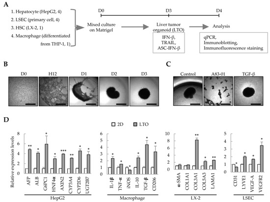 A mixture of equal parts DMEM and ECM (DMEM/ECM; 1:1) was used to culture liver tumor organoids. Matrigel (Corning Life Sciences, Corning, NY, USA) was mixed with DMEM/ECM at a 1:1 ratio, then 50 µL per well was added to a 96-well plate and gelled in a cell culture incubator for at least 10 min. To prepare liver tumor organoids, HepG2 cells, LSECs, macrophages differentiated from THP-1, and LX-2 cells were mixed at a ratio of 4:4:1:1. A total of 1 × 105 cells were seeded in Matrigel-coated wells; the medium was replaced with fresh medium on days 2 and 3. For 2D culture, HepG2 cells, LSECs, macrophages, and LX-2 cells were cultured in 96-well plates without a Matrigel coating. To determine whether TGF-β plays an important role in the process of liver tumor organoid generation, the TGF-β type 1 receptor inhibitor A83-01 was added at a concentration of 500 nM on day 0. IFN-β (1000 or 10,000 U/mL), TRAIL (10 or 50 ng/mL), ASC-IFN-β (1 × 104 cells), and JAK inhibitors (10 µM each of JAK1 and JAK2 inhibitors) were added on day 3.