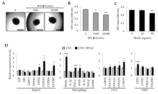 Effect of IFN-β on liver tumor organoids. On day 3, liver tumor organoids were treated with IFN-β for an additional day. (A) Representative images after IFN-β treatment. Liver tumor organoids exposed to IFN-β retained their spherical shape. Scale bar: 1 mm. (B,C) Decreased viability of liver tumor organoids induced by IFN-β or TRAIL. (D) Gene expression profiles in IFN-β-treated liver tumor organoids. Target gene expression was normalized to that of GAPDH. Relative fold changes in mRNA expression were measured using the 2−(ΔΔCt) method. Data are presented as the mean ± standard deviation (SD) of three replicates. * p < 0.05, ** p < 0.01, and *** p < 0.001. LTO: 3D-cultured liver tumor organoids; LX-2: human hepatic stellate cells; LSEC: primary liver sinusoidal endothelial cells.