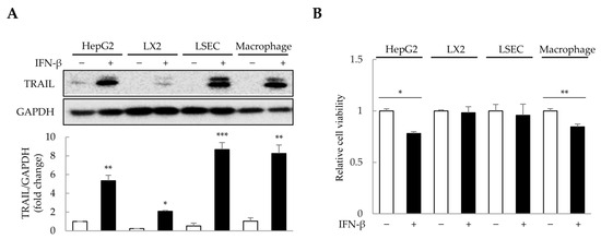 IFN-β-induced TRAIL expression in 2D-cultured cells. To determine the cells that express TRAIL and whose viability would be affected by IFN-β, 2D-cultured HepG2 cells, primary liver sinusoidal endothelial cells (LSECs), LX-2 human hepatic stellate cells, and macrophages were treated with IFN-β for 1 day. TRAIL expression was then analyzed via immunoblotting, and cell viability was determined using the WST-1 assay. (A) IFN-β-induced TRAIL expression in the four cell types. The intensity of protein bands was quantified through densitometry using ImageJ (National Institutes of Health, https://imagej.net/ij/index.html, 10 August 2023), and its relative expression was normalized to that of GAPDH. Data are presented as the mean ± SD of three independent experiments. * p < 0.05, ** p < 0.01, and *** p < 0.001. (B) Cell viability upon IFN-β treatment in the four cell types. Data are presented as the mean ± SD of three independent experiments. * p < 0.05 and ** p < 0.01.