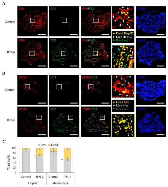 Cell death induced by IFN-β in liver tumor organoids. To label HepG2 cells or macrophages, antibodies against CK8 or EMR1, respectively, were used for staining liver organoid sections obtained on day 4 with and without IFN-β treatment. Dead cells were evaluated for cleaved-caspase 3 (CC3) expression. (A) Death of CK8-positive HepG2 cells in liver tumor organoids treated with IFN-β. Green arrowheads indicate dead cells other than HepG2. Yellow arrowheads indicate dead HepG2 cells. White arrowheads indicate live HepG2 cells. Scale bar: 500 µm. (B) Cell death of EMR1-positive macrophages in liver tumor organoids treated with IFN-β. Dark green arrowheads indicate dead cells other than macrophages. Dark yellow arrowheads indicate dead macrophages. Gray arrowheads indicate live macrophages. Scale bar: 500 µm. In (A,B), the white boxes indicate areas that have been enlarged to distinguish the staining of the cells. (C) Quantitative analysis of IFN-β-induced cell death in HepG2 cells and macrophages in liver tumor organoids. The number of CC3-positive HepG2 cells and macrophages was counted in three independent experiments, with more than 500 cells counted per experiment. Data are presented as the mean ± SD of three independent experiments. * p < 0.05 and ** p < 0.01.