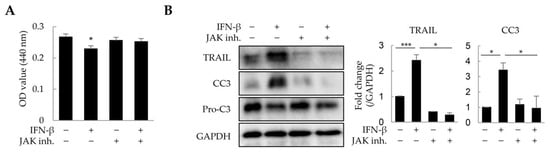 Suppression of IFN-β-induced cell death by JAK inhibitors in liver tumor organoids. Liver tumor organoids were treated with JAK inhibitors (10 µM each of JAK1 and JAK2 inhibitor) for 20 min prior to IFN-β treatment. After 24 h, the viability of organoids was analyzed using the WST-1 assay, and the expression of TRAIL and cleaved-caspase 3 (CC3) was analyzed by immunoblotting. (A) Viability of liver tumor organoids treated with IFN-β and/or JAK inhibitors. (B) Expression of TRAIL and cleaved-caspase 3 (CC3) in liver tumor organoids treated with IFN-β and/or JAK inhibitors. The results are presented as the mean ± standard deviation (SD) of three replicates. * p < 0.05 and *** p < 0.001; inh: inhibitor.