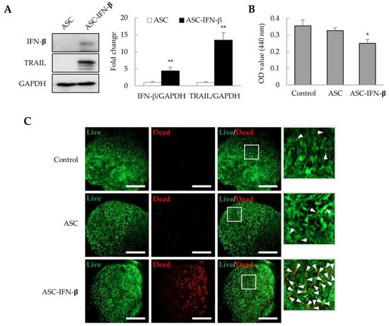 In a previous study, we observed that ASCs overexpressing IFN-β could effectively inhibit tumor proliferation in xenograft models [26,27]. ASCs were transformed with pCMV3-IFN-β, and after 1 day, IFN-β and TRAIL expression was identified by immunoblotting. We also analyzed whether ASCs overexpressing IFN-β (ASC-IFN-β) could regulate the viability of liver tumor organoids. In genetically modified ASCs with pCMV3-IFN-β (ASC-IFN-β), IFN-β expression was increased by approximately 4.4-fold, while TRAIL expression was increased by approximately 13.4-fold compared to that in the controls (Figure 6A). When these ASC-IFN-β were added to liver tumor organoids, the viability of liver tumor organoids was significantly decreased (Figure 6B) and the frequency of dead cells was significantly increased (Figure 6C). These results suggest that ASC-IFN-β can reduce the survival rate of liver tumor organoids owing to IFN-β and TRAIL overexpression.