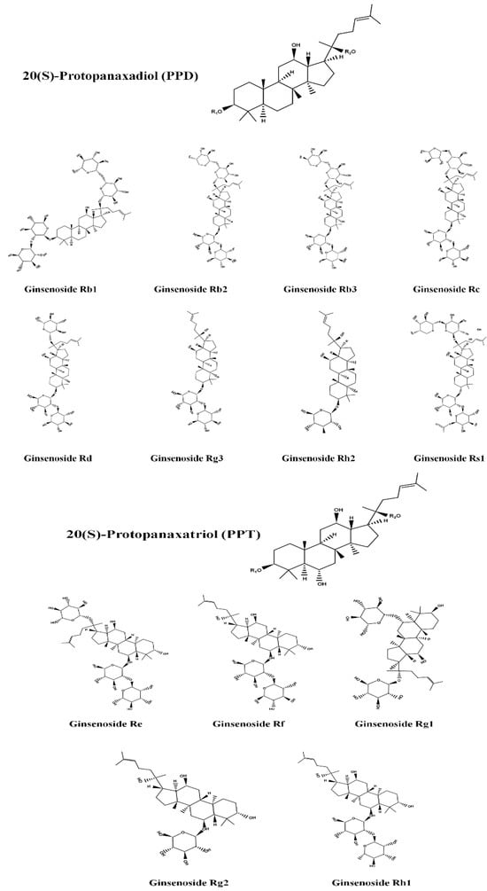 Ginseng, a traditional herb, has been used for over 5000 years for its potential health benefits. Initially, it was thought to have properties that could prolong human life. However, contemporary research has revealed its versatile therapeutic effects against a wide range of disorders, including physical ailments, viral diseases, and several types of cancer []. Several species of ginseng belong to the genus Panax, but Panax ginseng, also known as Korean ginseng, P. quinquefolius—American ginseng, P. japonicus—Japanese ginseng, and P. notoginseng—Sanqi ginseng stand out. Korean ginseng in particular has attracted a lot of interest and is widely used around the world [,]. Researchers have mainly focused on its roots, which come in several varieties, such as fresh, white, and red ginseng, depending on how much water they contain and how they have been processed. In particular, red ginseng undergoes a special processing stage involving incubation in 100 °C steam for more than two hours until its moisture content is reduced to less than 15% []. The primary bioactive constituents of ginseng, known as ginsenosides, are responsible for most of its medicinal effects. These ginsenosides have the prefix “Rx” before their names, where “x” indicates the polarity of the compound as measured by thin layer chromatography [,,]. The least polar ginsenoside is known as Rh, while Ra is the most polar. Based on structural variations, ginsenosides can be further divided into four types: 20(S)-Protopanaxadiol (PPD), 20(S)-Protopanaxatriol (PPT), ocotillol and oleanolic acid types. Ginsenosides of the PPD type include Ra1, Ra2, Ra3, Rb1, Rb2, Rb3, Rc, Rd, F2, Rg3, Rg5, Rh2, Rh3, compound K, and PPD. Re, Rg1, Rg2, Rg4, Rh1, Rh4, Rf, and PPT form the PPT-type ginsenosides [] (Figure 1). In addition, 24(R)-pseudoginsenoside-F11, 24(R)-pseudoginsenoside-RT5, majonoside R1, and R2 are among the chemicals that make up the ocotillol-type ginsenosides. Finally, Ro is a ginsenoside similar to oleanolic acid. The various therapeutic benefits associated with ginseng are a result of these ginsenosides, whose diverse structures and properties have stimulated continued study and interest in the fields of natural medicine and health sciences.