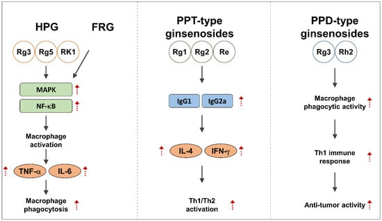 Ginseng has long been used as an immunomodulating herb. Ginseng can be used to boost human immunity and reduce inflammation caused by infections from external microbes [,,,,]. Although ginseng has long been known for its immune-boosting properties, research is still underway to understand the complex mechanisms that underlie these effects. In order to understand the precise functions of different ginsenoside types, numerous studies have isolated and investigated these compounds [,,,]. In one of these studies, the immunomodulatory properties of heat-processed ginseng (HPG), including the Rg3, Rg5, and Rk1 complexes, were compared. Their research showed that HPG dramatically increases macrophage activation by interacting with the MAPK and NF-κB signaling pathways, primarily through the ERK and c-Jun pathway [,].