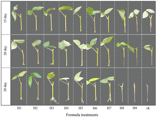 The different formulas obviously affected the rooting process of the softwood cuttings (Figure 1 and Figure S1). For example, after 15 days of cuttage, all cuttings entered the initial expansion stage apart from the treatments of ck, H1, H8, and H9. However, one-third of the cuttings in the H3 treatment were at the rooting stage after 20 days of cuttage, whereas most of the cuttings were still at the callus formation stage in the other treatments. Notably, about half of the cuttings in the ck, H8, and H9 treatments were at the initial expansion stage, while about 5% and 50% of the cuttings in H8 and ck tended to be blackened and rotted at the cutting base, respectively. However, after 30 days of cuttage, the majority of cuttings in the H3 treatment, half in the H7 treatment, and one-third of cuttings in the H4 and H6 treatments were at the rooting stage, respectively (Figure S1). It is worth noting that all the cuttings in the ck treatment, as well as 33% of the cuttings in the H8 and H9 treatments, have been blackened and rotted at the cutting base (viewed as dead).