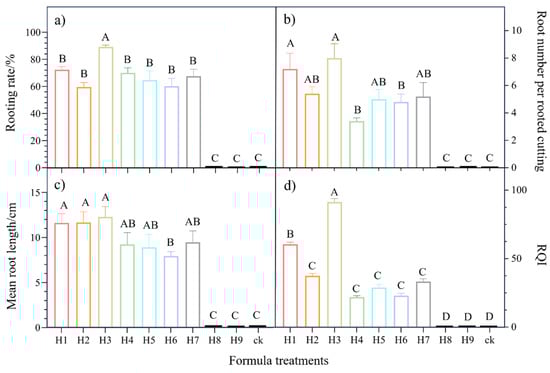 Similarly, the root number per rooted cutting (Figure 2b), mean root length (Figure 2c), and root quality indexes (RQIs, Figure 2d) were also significantly affected by the various formula treatments (p < 0.05). For instance, the RQI values among the different treatments were ranked as H3 > H1 > H2 > H7 > H5 > H6 > H4 > H8 ≧ H9 ≧ ck. The RQI reached 91.36 in the H3 treatment, which is 30.79, 53.81, 58,04, 62.51, 68.36, and 69.37 greater than that in the H1, H2, H7, H5, H6, and H4 treatments, respectively.