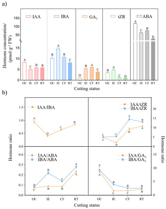 The dynamics of phytohormone concentrations and the ratios of auxin to other phytohormones in C. paliurus soft cuttings during AR formation. (a) The concentration dynamics of auxin (IAA and IBA), cytokinin (tZR), gibberellin (GA1), and abscisic acid (ABA). (b) Dynamics in the ratios of auxin (IBA and IAA) to other phytohormones (tZR, GA1, and ABA represent cytokinin, gibberellin, and abscisic acid, respectively). Different capital letters indicate statistically significant variations among the AR formation status for the same phytohormone (p < 0.05). OC: original cutting; IE: cuttings in the initial expansion stage; CF: cuttings in the callus formation stage; and RT: cuttings in the rooting stage.