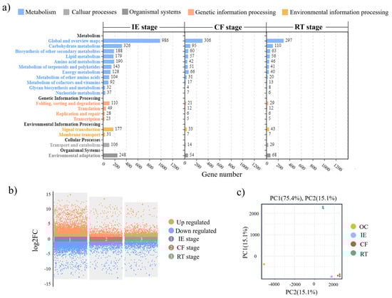 Using RNA-seq technology, 165,171,744,300 bp of raw data were generated. After filtering, 163,774,529,712 bp of clean data were mapped to the reference transcriptome (Table S1), and the average mapping ratio was 90.3% (Table S2). A total of 12,028 expressed genes were detected in all the samples. However, 7802 DEGs (4481 up-regulated and 3321 down-regulated) were detected in the IE stage, while 1955 DEGs (826 up-regulated and 1129 down-regulated) were found in the CF stage. In the RT stage, 2271 DEGs were detected, where 1452 were upregulated and 819 were downregulated (Figure 4b). PCA results showed that PC1 and PC2 explained 74.5% and 15.1% of the variation in gene expression among all the samples, respectively (Figure 4c).