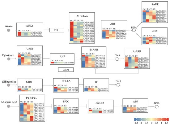 The expression profiles of the phytohormone-related genes in C. paliurus soft cuttings during AR formation. Red indicates up-regulated genes, and blue indicates down-regulated genes. OC: original cutting; IE: cuttings in the initial expansion stage; CF: cuttings in the callus formation stage; and RT: cuttings in the rooting stage.