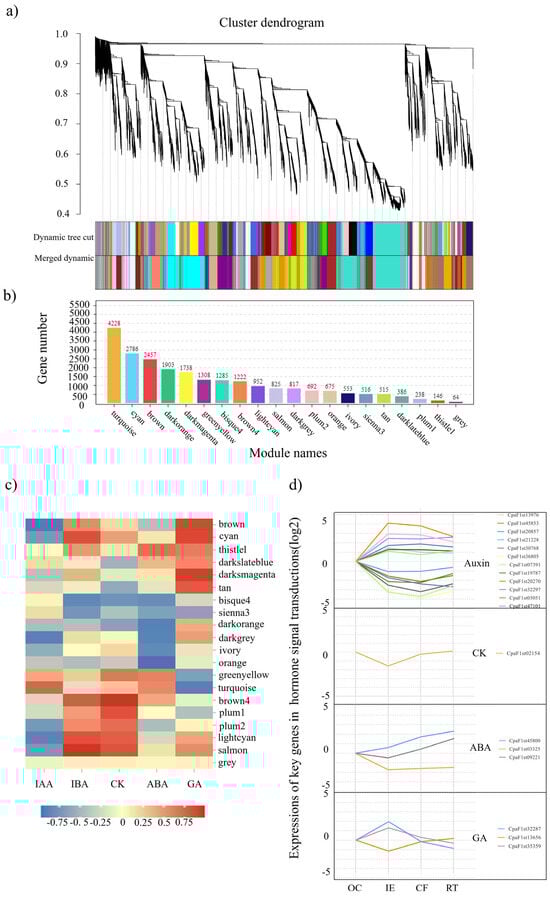 The results of the gene co-expression network analysis. (a) A hierarchical cluster tree identified by means of a WGCNA. Hierarchical cluster tree showing co-expression modules, while the major tree branches constitute 20 modules labeled using different colors. (b) The number of genes in each module. (c) The heatmap of correlation coefficients between phytohormone dynamics and module eigengenes, with the red and blue blocks representing positive and negative correlations, respectively. (d) Key genes involved in hormonal regulation identified by the WGCNA analysis and their expression patterns. CK, GA, and ABA represent cytokinin, gibberellin, and abscisic acid, respectively. OC: original cutting; IE: cuttings in the initial expansion stage; CF: cuttings in the callus formation stage; and RT: cuttings in the rooting stage.