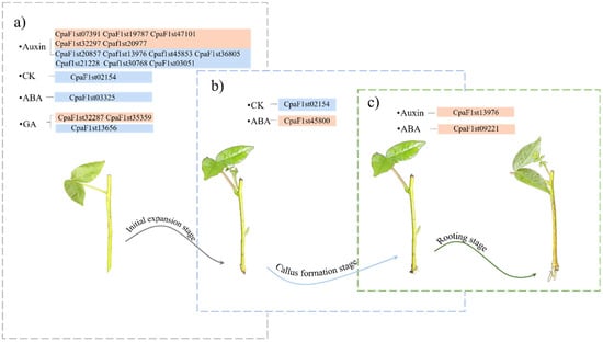 Key genes involved in hormone regulation at different AR formation stages of C. paliurus cuttings. (a) The expression of the key genes involved in hormonal regulation during the initial expansion stage. (b) The expression of the key genes involved in hormonal regulation during the callus formation stage. (c) The expression of the key genes involved in hormonal regulation during the rooting stage. CK, GA, and ABA represent cytokinin, gibberellin, and abscisic acid, respectively. Orange blocks indicate the up-regulated genes, while the blue ones show the down-regulated genes.