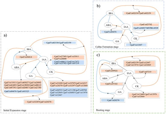 Auxin cross-regulatory interactions between auxin and various hormones during the AR formation of C. paliurus cuttings: (a), (b), and (c) show the hormone cross-regulatory interactions at the stages of initial expansion, callus formation, and rooting, respectively. CK, GA, and ABA represent cytokinin, gibberellin, and abscisic acid, respectively. The orange line indicates a positive correlation between hormones, the blue line indicates a negative correlation, and the gray line indicates no significant correlation between the hormones. Orange blocks indicate up-regulated genes, while the blue ones show the down-regulated genes.