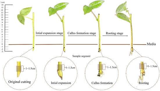 Based on the results from our pre-experiment, we sampled the cuttings to check for the rooting process on days 15, 20, and 30 after cuttage. In each sampling time, 15 cuttings were sampled for each treatment (e.g., 5 cuttings for each replicate) to record the rooting status. The rooting process was divided into three stages in this study (Figure 9), i.e., stage 1 (initial expansion, IE), stage 2 (callus formation, CF), and stage 3 (rooting, RT). In total, 150 cuttings in each sampling time were collected and immediately frozen in liquid nitrogen and stored at −80 °C for further phytohormone measurement and RNA extraction. The final rooting parameters, such as the rooting rate, root number, and root length, were recorded and measured 60 days after treatment.