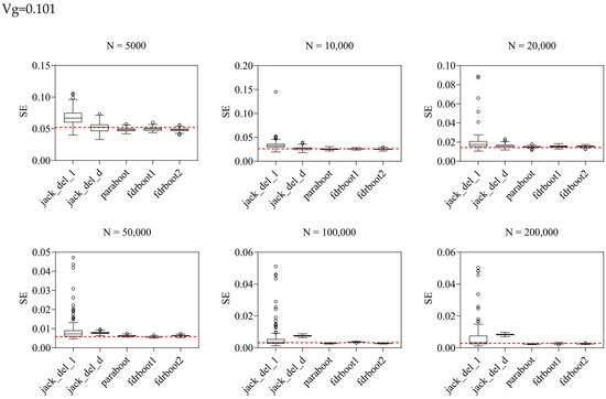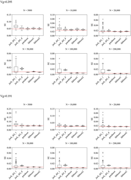 Boxplots of SE estimated by different approaches. Vg is the sum of variance explained, N is the sample size, and the horizontal line refers to true SE calculated by repeating the experiments 100 times based on the true data generating mechanism. jack_del_1, jack_del_d, paraboot, fdrboot1 and fdrboot2 are different SE estimation approaches as described above.