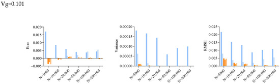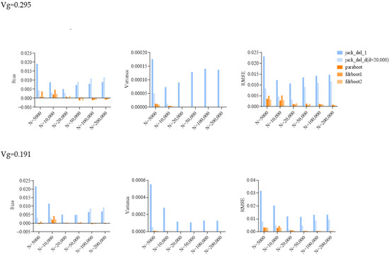 Bar plots of bias, variance and root mean squared error (RMSE) of SE estimated by different approaches in simulations. Vg is the sum of variance explained, and N is the sample size. jack_del_1, jack_del_d, paraboot, fdrboot1 and fdrboot2 are different SE estimation approaches as described above.