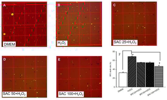 Optical microscopy was utilized to observe cell density as a representation of the cell death ratio. In the control group (A), for RPE cells cultured in DMEM, there were numerous RPE cells with the least cell death ratio. Furthermore, oxidative stress induced by incubation of the RPE cells with 500 μM H2O2 (B) for 24 h drastically reduced the number of RPE cells, which is associated with a significantly greater cell death ratio. In contrast with (B), (C–E) indicate that 15 min of pre-incubation with 25, 50, and 100 μM SAC resulted in a dose-dependent and significant protection of the RPE cells against the oxidative stress, which was particularly associated with the significantly smallest cell death ratio at 100 μM SAC. In (B,F), compared with the RPE cells cultured in DMEM (control; A,F), a 24 h incubation of RPE cells with 500 μM H2O2 significantly (* p < 0.05) increased the cell death ratio or reduced the cell viability. In contrast, 15 min of pre-incubation with 25, 50, or 100 μM of SAC dose-dependently and significantly (at 100 μM; † p < 0.05) ameliorated the H2O2-induced increase in the cell death ratio. RPE living cells: black; PI-stained dead cells: green. Results are represented as the mean ± SD (n = 3).