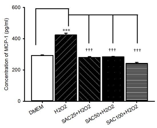 Analysis of the expression of MCP-1 protein levels by ELISA. Cells were evaluated twenty-four hours after 500 μM H2O2-induced oxidative stress relative to cells incubated in DMEM (control). Oxidative stress resulted in a significant (*** p < 0.001) upregulation of MCP-1 protein levels. This significant elevation was significantly (††† p < 0.001) attenuated by 15 min of pretreatment with 25, 50, and 100 μM SAC. Results are displayed as the mean ± SD (n = 3).