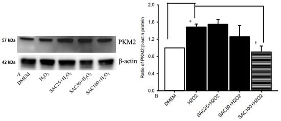 Analysis of the expression of PKM2 protein via Western blotting. The left image showed the blots for expressions of β-actin (lower row) and PKM2 protein (upper row). Column 1 in the right bar chart showed the cells that were cultured in DMEM; column 2 demonstrated the cells that were incubated in H2O2; columns 3–5 revealed the H2O2-injured cells that were pre-administrated with 25/50/100 μM of SAC for 15 min. Twenty-four hours after 500 μM H2O2-induced oxidative stress in comparison with the cells incubated in DMEM (control), the analysis of cells revealed that oxidative stress resulted in a significant (* p < 0.05) upregulation of PKM2 protein levels. This elevation was significantly († p < 0.05) mitigated by 15 min of pretreatment with 100 μM SAC. Results are expressed as the mean ± SD (n = 4).