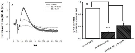 As shown in Figure 4A, there was a considerably reduced ERG b-wave amplitude following pressure-induced retinal ischemia and post-ischemic administration of the vehicle, which is represented as the I/R + Vehicle group. Based on Figure 4B, there was a significant (*** p < 0.05) reduction in the b-wave ratio in the I/R + Vehicle group (0.20 ± 0.04; n = 8) at 1 day following ischemia, relative to the normal group (1; n = 8). Importantly, significant († p < 0.05) attenuation of this reduction was shown with post-ischemic administration of SAC at 100 μM (I/R + SAC; 0.43 ± 0.08; n = 7).