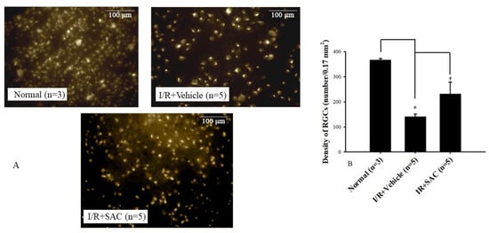 The density of RGCs calculations is shown in Figure 5A, which was divided into the normal retina (left image), the post-ischemic vehicle-treated retina (middle image), and the retina with post-ischemic administration of 100 μM SAC (right image). In Figure 5B, there was a significant (* p < 0.05) difference between the normal group (366.78 ± 5.95; n = 3) and the I/R + Vehicle group (141.00 ± 9.92; I/R + Vehicle, n = 5). Further analysis also revealed a significant difference († p < 0.05) between the I/R + Vehicle group and the I/R + 100 μM SAC group (231.70 ± 46.65; I/R + SAC; n = 5), which greatly demonstrates the neuroprotective effects of SAC against I/R.