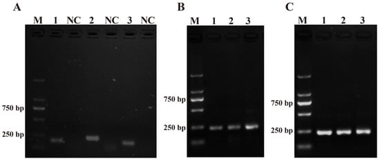 The amplification temperature and time were optimized to achieve the best amplification effect. Initially, three gradients were set to determine the optimum reaction time for RPA between 10 and 20 min. As shown in Figure 1B, lane 2 was the clearest and brightest. Therefore, 15 min was chosen for RPA. Moreover, to achieve the amplification result as quickly as possible, the RPA amplification temperature was optimized in a temperature range of 35–39 °C. As shown in Figure 1C, lane 1 (35 °C), lane 2 (37 °C), and lane 3 (39 °C) all had bright bands. All three reaction temperatures could be used as conditions for subsequent experiments. Also, in order to reduce the heating-up time, 37 °C was chosen as the final reaction temperature for RPA.
