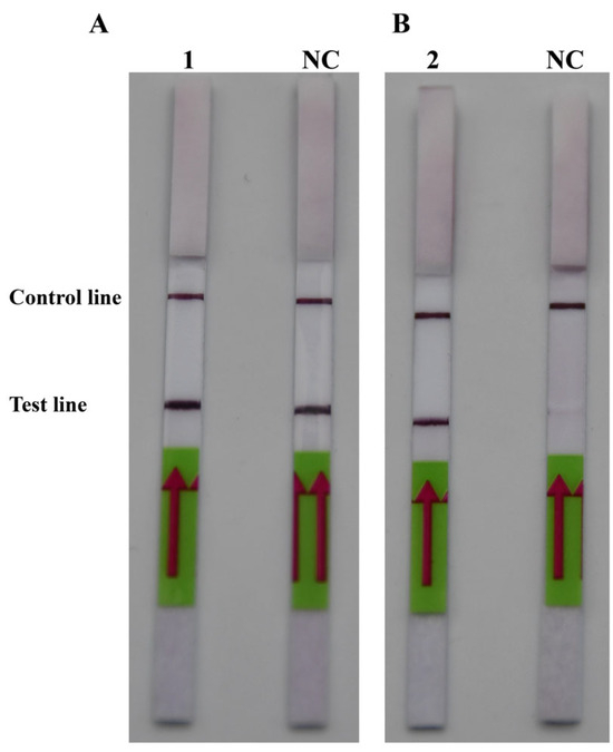 The optimal probes. (A) 1: PM-P-1; NC: negative control of probe PM-P-1. (B) 2: Probe PM-P-2; NC: negative control of probe PM-P-2.