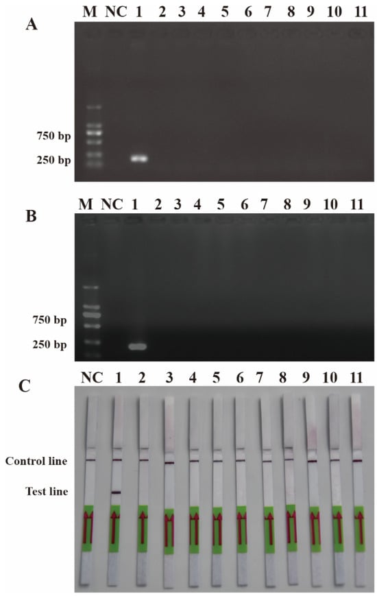 Specificity validation. (A) Polymerase chain reaction; (B) recombinase polymerase amplification; (C) recombinase polymerase amplification with lateral flow dipstick. M: DL2000 DNA marker; NC: negative control; Lane 1: P. multiseries; Lane 2: T. pseudonana; Lane 3: C. debilis; Lane 4: P. tricornutum; Lane 5: P. parvum; Lane 6: Trichodesmium sp.; Lane 7: S. costatum; Lane 8: T. rotula; Lane 9: C. curvisetus; Lane 10: P. pungens; Lane 11: P. delicatissima.