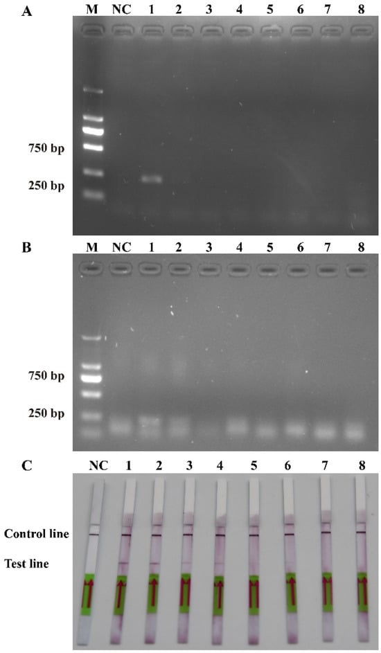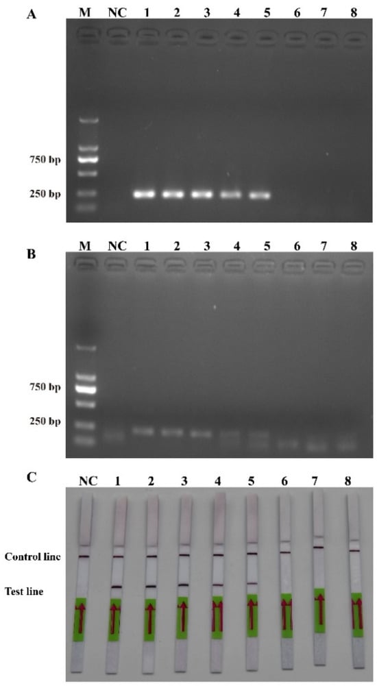 Comparison of the sensitivities of the polymerase chain reaction (A), recombinase polymerase amplification (B), and recombinase polymerase amplification with lateral flow dipstick (C) with the genomic DNA (gDNA). M: DL2000 DNA marker; NC: negative control; Lanes 1–8: gDNA concentration range from 2.0 × 104 to 2.0 × 10−3 pg/μL.