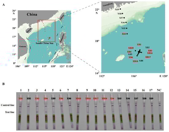 The detection of the recombinase polymerase amplification with lateral flow dipstick assay for the field water samples from the South China Sea. (A) Geographical distribution of the water samples in this study. The results of the positive samples are indicated in red font. (B) The results are displayed on the test strips. NC: negative control.