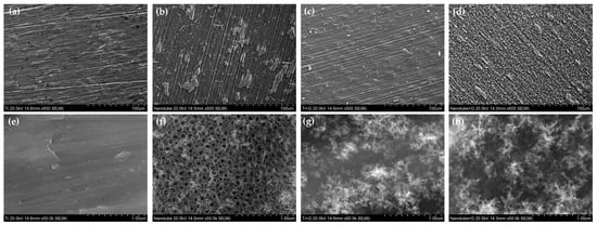 Surface morphology of (a,e) polished titanium (control group), (b,f) TiO2 nanotube titanium (Group N), (c,g) reduced graphene oxide-deposited titanium (Group G), and (d,h) reduced graphene oxide-deposited TiO2 nanotube titanium (Group NG) ((a–d): magnification = 500, (e–h): magnification = 50,000).