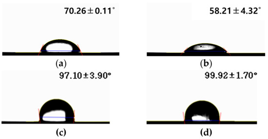 Contact angle of (a) polished titanium (control group), (b) TiO2 nanotube titanium (Group N), (c) reduced graphene oxide-deposited titanium (Group G), and (d) reduced graphene oxide-deposited TiO2 nanotube titanium (Group NG).