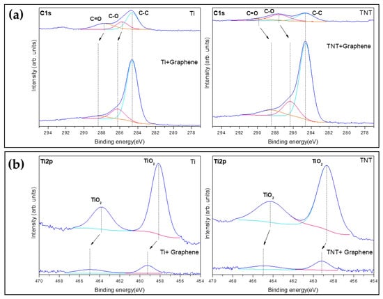 After rGO deposition, the C1 peaks of the Ti samples increased, and the low peaks between 288.3 and 286.2 eV were slightly shifted to a higher bonding energy. The C1 peaks of TNT also increased, while the low peaks between 289.7 and 287.6 eV were slightly shifted to a lower bonding energy. The Ti2p peaks were slightly shifted to a higher bonding energy.