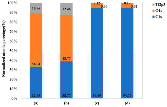 Normalized atomic percentage of each element on (a) polished titanium (control group), (b) TiO2 nanotube titanium (Group N), (c) reduced graphene oxide-deposited titanium (Group G), and (d) reduced graphene oxide-deposited TiO2 nanotube titanium (Group NG).