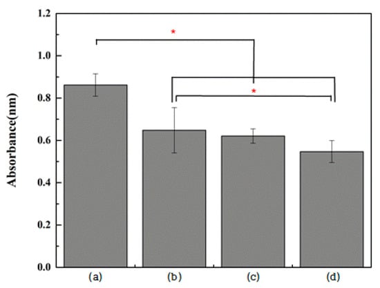 Absorbance level of S.mutans after incubation for 24 h on (a) polished titanium (control group), (b) TiO2 nanotube titanium (Group N), (c) reduced graphene oxide-deposited titanium (Group G), and (d) reduced graphene oxide-deposited TiO2 nanotube titanium (Group NG) (the result of one-way ANOVA test, *: significant at p < 0.05).