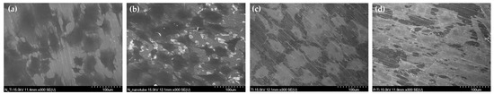 The adhesion of MC3T3-E1 cells was observed using a scanning electron microscope (SEM). Two specimens per group were placed in a 24-well plate, and 4 × 104 cells/mL of MC3T3-E1 cells were dispensed onto the specimens and cultured in an incubator set at 5% CO2 and 37 °C for 4 h. After 4 h of cell culture, the cells on the specimens were fixed in 2.5% glutaraldehyde for 2 h. After carefully washing with PBS solution twice, the cells were dehydrated in an ethanol gradient in the order of 40%, 50%, 60%, 70%, 80%, 90%, and 100% for 10 min at each concentration. The sample was dried on a clean bench for 2 h after the dehydration process. The cell morphology was observed using an SEM.