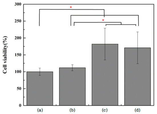 Evaluation of MC3T3-E1 cell viability after incubation for 24 h on (a) polished titanium (control group), (b) TiO2 nanotube titanium (Group N), (c) reduced graphene oxide-deposited titanium (Group G), and (d) reduced graphene oxide-deposited TiO2 nanotube titanium (Group NG) (the result of Kruskal–Wallis test, *: significant at p < 0.0083).