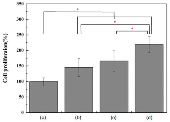 Evaluation of MC3T3-E1 cell proliferation after incubation for 72 h on (a) polished titanium (control group), (b) TiO2 nanotube titanium (Group N), (c) reduced graphene oxide-deposited titanium (Group G), and (d) reduced graphene oxide-deposited TiO2 nanotube titanium (Group NG) (the result of Kruskal–Wallis test, *: significant at p < 0.0083).