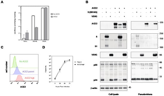 The infection with HIV-based SARS-CoV-2 S pseudotyped virus was performed as previously described [26,54,55]. In brief, 293T cells were transfected with pNL-LucΔBglII [54] and the S expression vector with the D614G mutation [33] or VSVG expression vectors, in the absence or the presence of FLAG-tagged ACE2, using Lipofectamine 3000 (Thermo Fisher Scientific, Waltham, MA, USA) according to the manufacture’s protocol. After 48 h of transfection, the recovered viruses were used to infect 293T cells expressing ACE2. After 48 h of infection, the luciferase activity of the infected cells was measured using a One-Glo luciferase assay system (Promega, Madison, WI, USA) and GloMax luminometer (Promega, Madison, WI, USA).