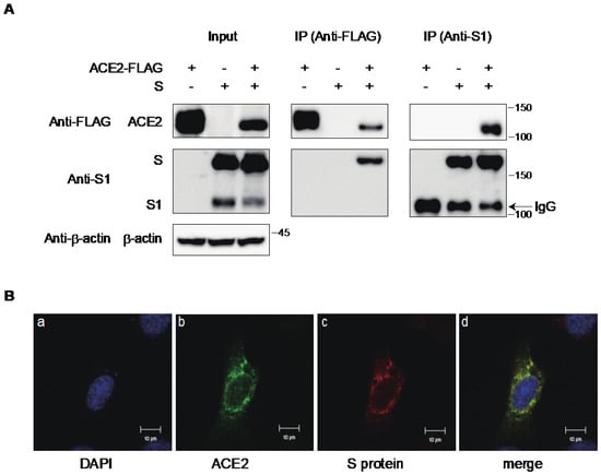 Interaction of ACE2 with the S protein of SARS-CoV-2 in 293T cells. (A) Cell lysates from the 293T cells transfected with FLAG-tagged ACE2 and S protein were analyzed by Western blotting using ant-FLAG, anti-S1, anti-β-actin antibodies. Immunoprecipitation (IP) was performed using anti-FLAG and anti-S1 antibodies with protein G-Sepharose beads, and the blots were analyzed with anti-S1 and anti-FLAG antibodies, respectively. The positions of the molecular mass marker (kDa) are indicated on the right. (B) Confocal microscopic images of the 293T cells transfected with ACE2-Venus (green) and the S protein. Panels show the counterstaining of cell nuclei with DAPI (a), ACE2-Venus (b), S protein (c), and merged image (d). Scale bars correspond to 10 μm.